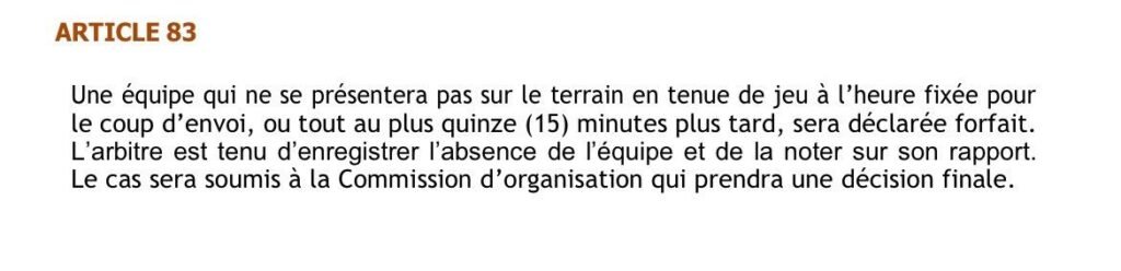 l’article 83 ne parait pas davantage pertinent. Il est de toute évidence que l’article s’applique avant le début d’une compétition : « Une équipe qui ne se présentera pas sur le terrain de jeu à l’heure fixée pour le coup d’envoi …etc ». Or dans notre cas, les deux équipes se sont présentées au coup d’envoi. le fait de quitter le terrain sur une contestation pendant le jeu, et revenir moins de 15 minutes après, est-il synonyme de forfait ?